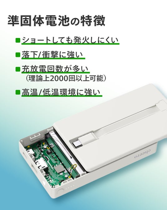 従来の常識を超える、安全で長寿命な「準固体(半固体)リチウムイオンバッテリー」搭載。10000mAhの大容量でスマートフォンを約2回フル充電でき、最大22.5Wの急速充電にも対応。ケーブル一体型なのにスリムなので、かさばらず持ち運びも快適です。厳しい検査をクリアしたセルのみを使用しているので安心。毎日の「持ち歩く電源」として、あなたの暮らしに寄り添うモバイルバッテリーです。