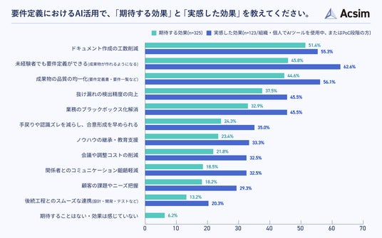 要件定義におけるAI活用によって期待する効果を尋ねたところ、「ドキュメント作成の工数削減」が51.4%で最も多く、「未経験者でも要件定義ができるようになる」が45.8%、「成果物の品質の均一化」が44.6%と続きました(n=325)。