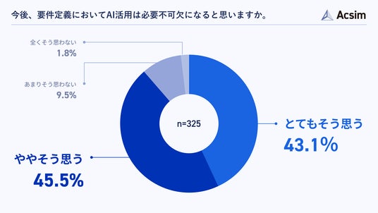 要件定義において、今後AI活用が必要不可欠になると思うかを尋ねたところ、「とてもそう思う」が43.1%、「ややそう思う」が45.5%で、合わせて約9割が必要不可欠と考えていることがわかりました(n=325)。