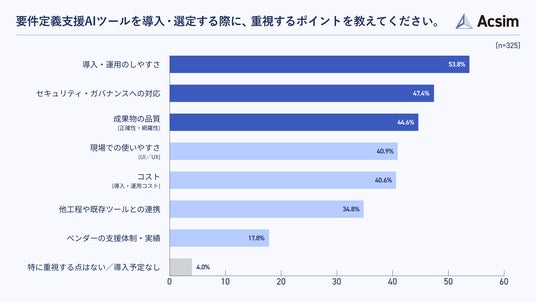 要件定義支援AIツールを導入・選定する際に重視するポイントについて尋ねたところ、「導入・運用のしやすさ」が53.8%で最も多く、「セキュリティ・ガバナンスへの対応」が47.4%、「成果物の品質」が44.6%と続きました(n=325)。