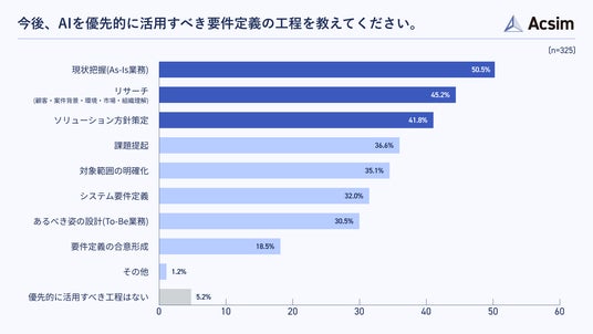 今後、要件定義のどの工程でAIを優先的に活用すべきだと思うかを尋ねたところ、「現状把握(As-Is業務)」が50.5%で最も多く、「リサーチ」が45.2%、「ソリューション方針策定」が41.8%と続きました(n=325)。
