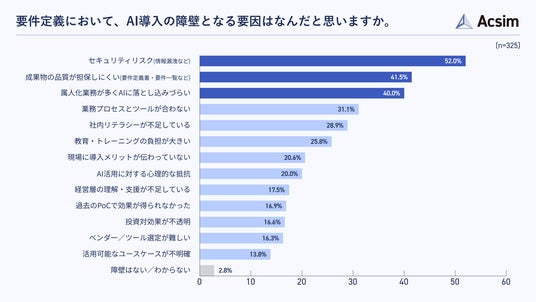 要件定義におけるAI導入の障壁について尋ねたところ、「セキュリティリスク」が52.0%と最も多く、「成果物の品質担保」が41.5%、「属人化業務が多くAIに落とし込みづらい」が40.0%と続きました(n=325)。