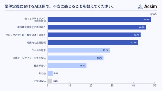 要件定義におけるAI活用で、不安を感じる点について尋ねたところ、「セキュリティリスク」が48.6%で最も多く、「著作権や学習元の不透明さ」が46.2%、「社内ノウハウ不足・教育コストの高さ」が43.7%と続きました(n=325)。
