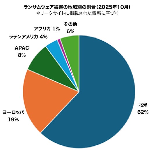 ランサムウェアは依然として最も深刻なサイバー脅威のひとつです。2025年10月には、世界全体で801件の被害が公表され、前年比48%増となりました。公表された事案の62%が北米で発生し、ヨーロッパが19%と続いています。国別ではアメリカが全世界の57%を占め、次いでカナダ(5%)、フランス(4%)となっています。