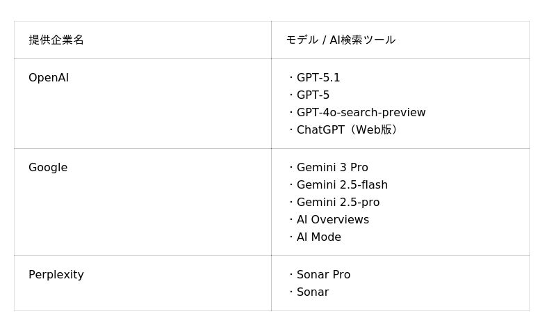 今回新たに「Gemini 3 Pro」「GPT-5.1」が追加され、AI Hackでは以下に示すモデルでAIOスコアを可視化できるようになりました。