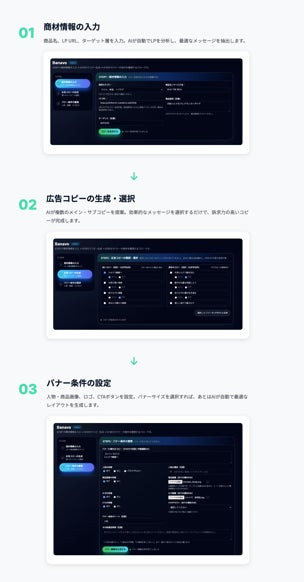 最新のAI画像生成技術(Nanobanana Pro)と、広告運用の知見を組み合わせた独自アルゴリズムにより、実用レベルの高品質なバナーを生成。すでに15社以上が導入し、ヘアケア、スキンケア、健康食品、不動産、飲食など、様々な業種で活用されています。
