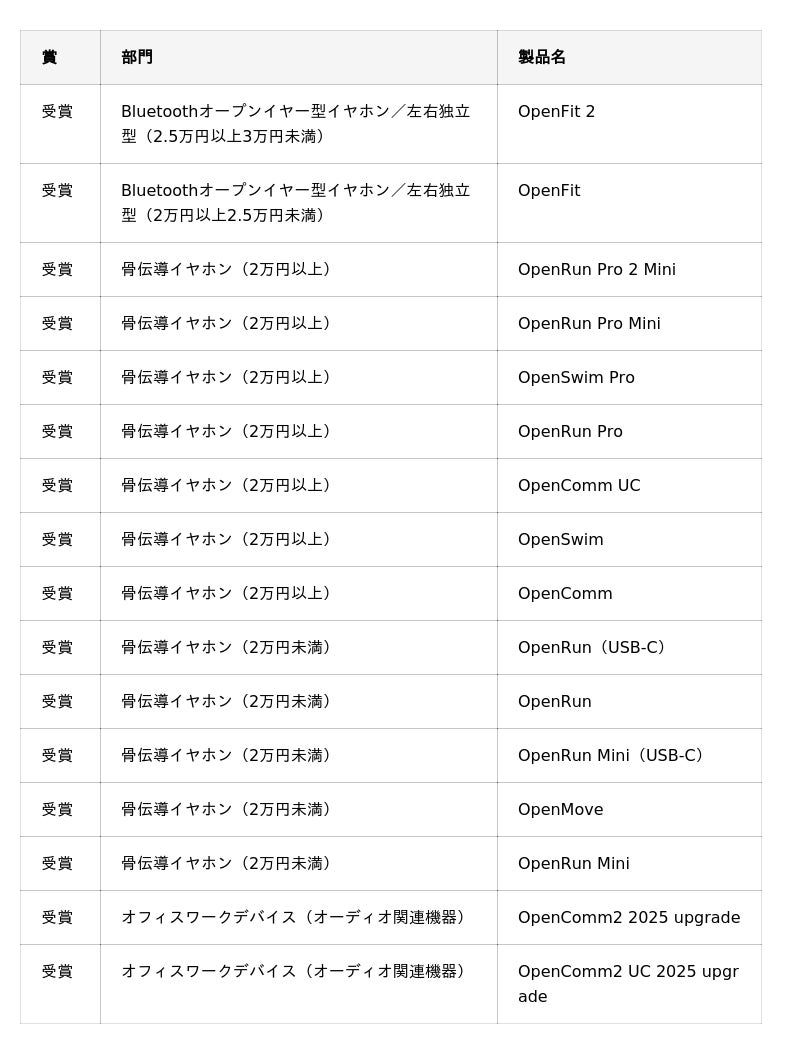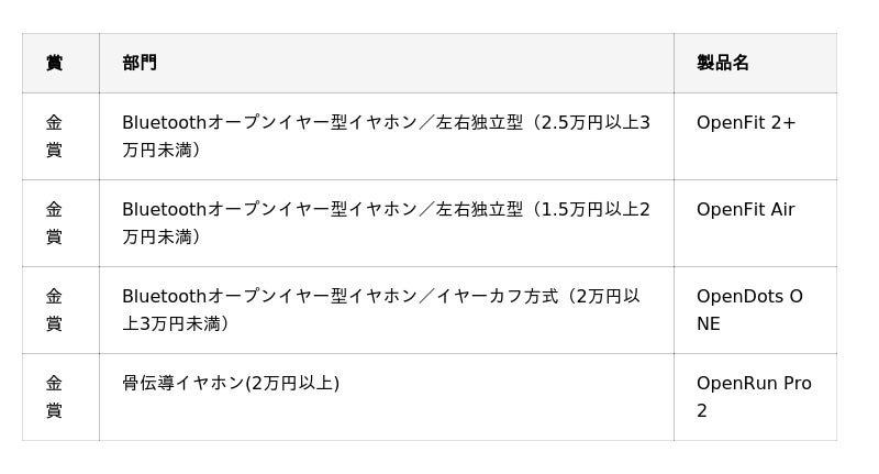 その他、Shokz骨伝導イヤホン、オープンイヤーイヤホン、イヤーカフ型イヤホンも部門賞を多数受賞