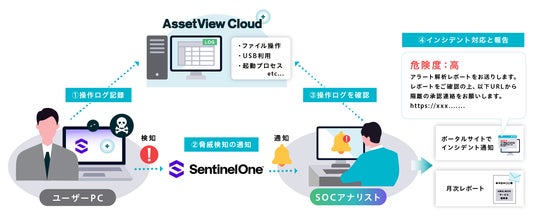 SentinelOneで脅威を検知した際、AssetView Cloud +の操作ログをSOCで確認し、「誰が」・「いつ」・「どのような操作をしたか」を時系列で把握することで、対応優先度の判断や誤検知排除、報告精度を向上します。