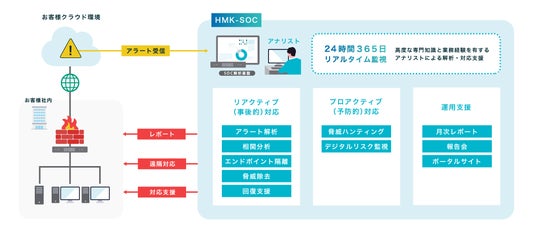 本サービスは、国内に多くの実績を持つMDRサービスプロバイダーの支援を受けて、24時間365日のリアルタイム監視を実現し、高度な専門知識と業務経験を有するアナリストによる解析・対応を支援します。