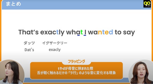 番組内では、MCの柴田阿弥さんが実際に90 Englishのレッスンを体験。言語学に基づいた「モーター性理論(発音できる音は聞き取れるようになるという理論)」を活用した指導により、"That's exactly what I wanted to say."というフレーズの発音が、わずか数分のレッスンで見違えるほど改善しました。
