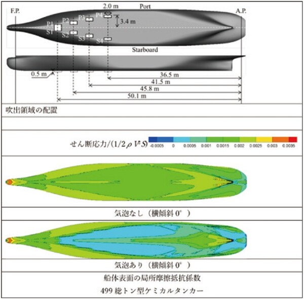 船底から空気を吹き出すようにすると、船舶と水との間の摩擦抵抗が減少し、船舶の燃費が向上する。これが「空気潤滑法」だ。一般に、水に含まれる小さな気泡の割合が増えると、摩擦抵抗は減少する。実験では100パーセント近くまで摩擦抵抗を減らすことができるが、実際の船舶では30~40パーセント程度の低減となっている。摩擦抵抗の減少は、船の速度や波などによっても変わってくる。さらに、空気の吹き出しを連続的ではなく周期的に行うことでも、摩擦抵抗を削減することができる。同研究所の新川大治朗主任研究員によると「数値シミュレーションを用いて、さまざまな条件下での気泡による摩擦抵抗減少の効果を検証している」という(図2)。
