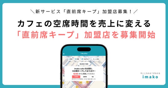 株式会社imako(本社:東京都渋谷区、代表取締役:浜田真衣)が運営するカフェ混雑情報マップ「imako(いまこ)」(https://app.imakoapp.com/availableReserveSpots?&utm_source=prtimes&utm_medium=seatkeeprelease )は、カフェの席を15分間確保できる新サービス「直前席キープ」の加盟店を東京都内で募集開始いたします。