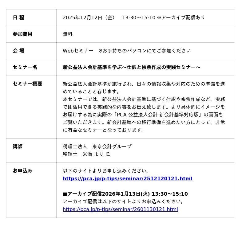 『PCAクラウド』や『PCAサブスク』をはじめとする、サブスクリプション型基幹業務システムを開発・販売するピー・シー・エー株式会社(代表取締役社長:佐藤文昭 本社:東京都千代田区 プライム銘柄コード9629 以下:PCA)は、公益法人様向け会計ソフト『PCA 公益法人会計シリーズ』の「新会計基準対応版」を2025年11月26日にリリースいたします。また、実際に「新会計基準対応版」を使用した新会計基準における実務を解説するオンラインセミナーを開催いたします。