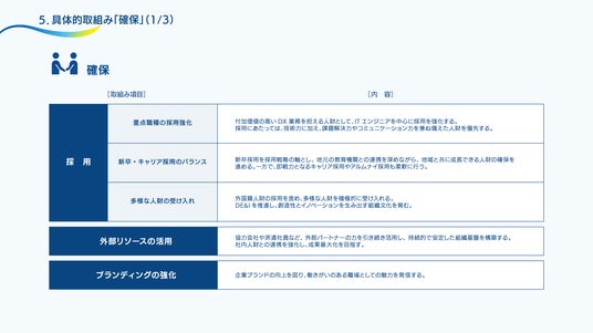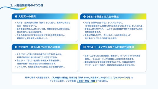 人財価値戦略では、「人的資本の拡充」「DE&I」「学び(キャリア自律・リスキリング)」「ウェルビーイング」の4つを柱に定め、3つの課題[ 確保・育成・活躍 ] へ取り組みます。