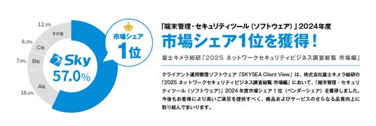 Sky株式会社ではこのたび、自社で開発するクライアント運用管理ソフトウェア「SKYSEA Client View」が、株式会社富士キメラ総研の「2025 ネットワークセキュリティビジネス調査総覧 市場編」(2025年10月17日発刊)において「端末管理・セキュリティツール(ソフトウェア)」2024年度市場シェア1位(ベンダーシェア)を獲得しました。