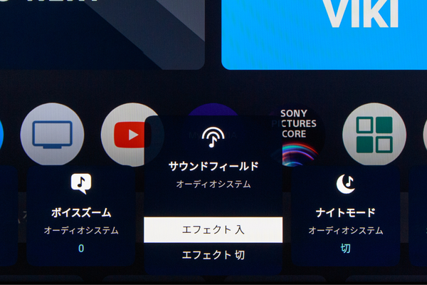 具体的には、「サウンドフィールド(立体音響効果のON/OFF)」「ボイスモード(セリフ強調)」「ナイトモード(音量を絞っても聞き取りやすくする)」といった、よく使う設定をテレビのリモコンを操作しながら、画面で確認し、パッと切り替えられます。