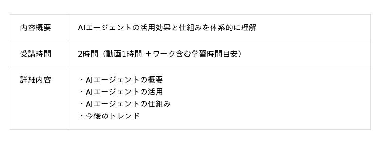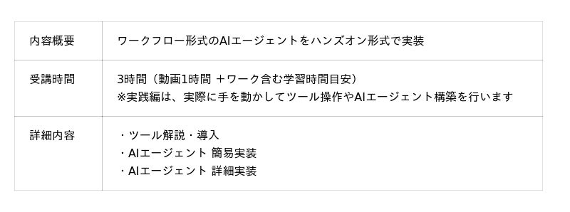 - 座学編: AIエージェントの基本概念、仕組み、役割を体系的に理解