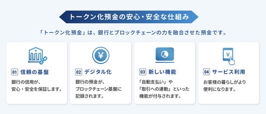 トークン化預金は、銀行預金をトークン化したもので、銀行預金と同じ安心・安全を備えながら、ブロックチェーンなどの技術を活用し、デジタル上で便利に使える預金です。取引記録や契約条件などのデータを連動させ、資金の流れのコントロールや自動化など、多様なサービスに活用できます。