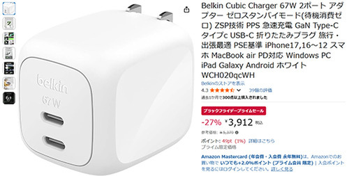 BelkinのGaN充電器「Belkin Cubic Charger 67W 2ポート アダプター」が、Amazonブラックフライデープライムセールに登場しました。