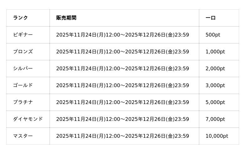 最低保証や購入ptは各ランクごとに変動いたします。