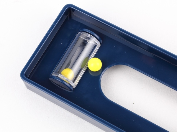 水平器とスコヤはどちらにも水平を見るゲージがついていますが、これば筒に黄色い球が入っているだけ。かなり歪んでいるため転がりが悪く、何に使うのかを想像するのも困難です。手間はかかりますが、BB弾と入れ替えたいですね。縦に2つある意味はないので、水平器というなら左右どちらかのゲージは斜め45度にしてほしかった、というのもあります。