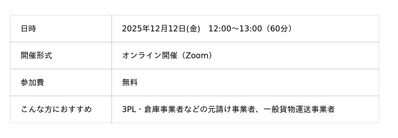 物流産業の変革を志すアセンド株式会社(本社:東京都新宿区、代表取締役社長:日下瑞貴、以下「当社」)は、2025年12月12日(金)に、2026年4月施行予定の改正貨物運送事業法に関する無料オンラインセミナーを開催いたします。法対応義務化まであと4か月に迫る中、早急に対応すべき事項について解説いたします。