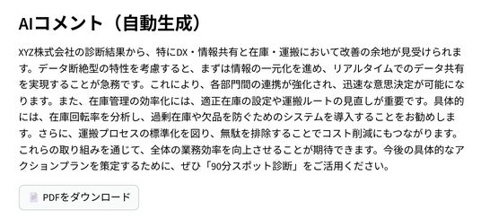 診断結果をもとに、AIが企業の状態を読み取り、数百字のコメントとして“改善の入口”を提示。