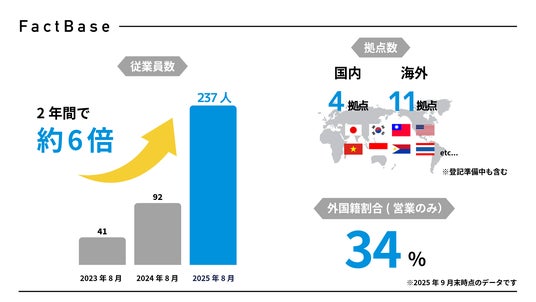 事業成長に伴い、組織規模も急速に拡大しています。従業員数は過去2年間で約6倍に増え、現在は国内4拠点、海外11拠点を展開。社員の約34%が外国籍メンバー(営業のみ)であり、多様なバックグラウンドを持つ人材が活躍しています。