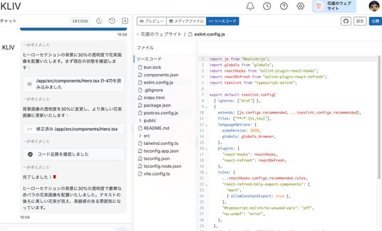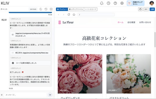 会話指示に応じて、KlivがJSファイルを読み込み、自動でコードを修正。花屋サイトのデザイン変更がそのままJSレベルで反映される様子を示す画面。
