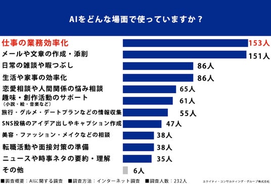 今回は、経営コンサルティングや生成AI導入支援を行っているエクイティ・コンサルティング・グループ株式会社が、ChatGPTなどのAIを使ったことがある20代の会社員232人を対象に、「AIに関する調査」を実施しました。