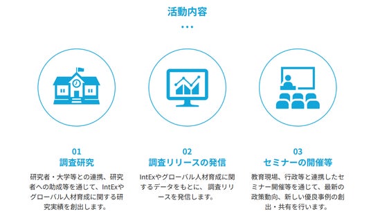 IntEx Labが目指すのは、省庁、学校・教育関係者、民間企業など多様なステークホルダーと連携することによる、グローバル人材育成と多様性の社会実装です。そのために、当面は、1.調査研究活動、2.調査データの公表、3.セミナーの開催の3つの活動に取り組みます。