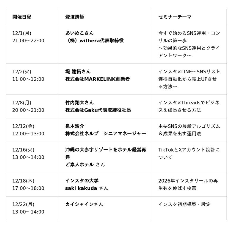 ■ 全7回|2025年12月 SNSコラボセミナー(無料/オンライン)