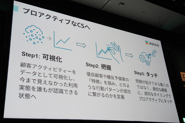 primeNumberの伴走とともに、「可視化」「把握」「タッチ」の3ステップで、プロアクティブ(能動的)なカスタマーサクセス活動への変革を進めた。たとえばステップ2の「把握」は、データを可視化して並べることで、「特定の行動を取った企業は優良顧客であり、アップセルの可能性が高い」、あるいは「離脱の可能性が高い」といった傾向を把握する段階だが、primeNumberの専門的な視点が入ったことで、「そうした特徴を適切に定義できた」と評価する。