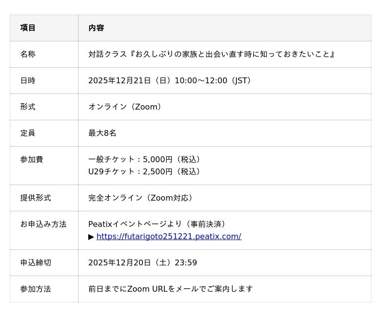 - お申し込み:Peatixイベントページ( https://futarigoto251221.peatix.com/ )