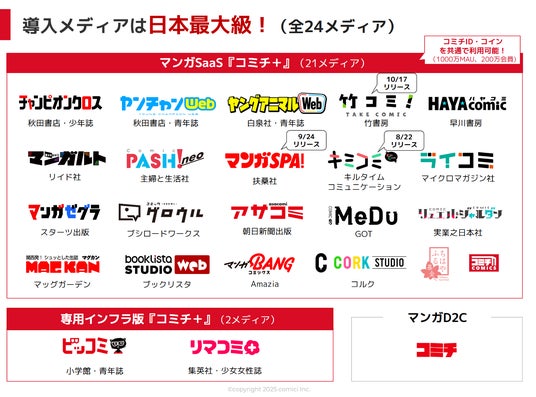また、「コミチ+」の導入により、先行して導入している「チャンピオンクロス(秋田書店)」「ヤングアニマルWeb(白泉社)」「竹コミ!(竹書房)」「ハヤコミ(早川書房)」をはじめとする24のメディアと共通のIDが使用可能になります。この仕組みが、新作の認知拡大に寄与することが期待されています。