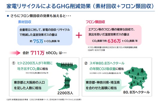 更に家電リサイクルの工程では製品に使用されている温室効果ガスであるフロン類も全量回収していますので、その大気放出を防いだ総量はCO2換算で約636万t-CO2換算/年あり、それらを合計した家電リサイクルによるGHG削減効果総量は約711万t-CO2換算/年となりました。