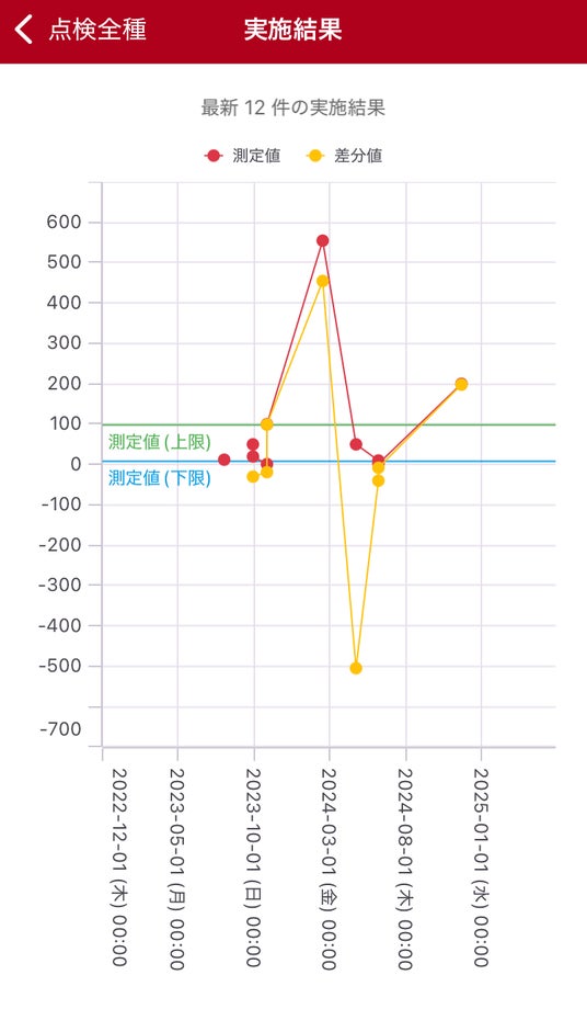 iOSアプリから設備点検結果の直近の傾向をグラフで確認できる機能を追加します。このグラフはMENTENAで点検作業を行う途中で、作業を中断することなく表示可能です。また、過去の点検時に登録したコメントなども確認できます。