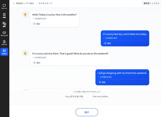 「フリートークモード」で「お互いの部活動」というテーマを入力してスタートした例。英語力が不安な学習者には「次の自分の応答の候補英文」や「日本語訳」も表示されます。