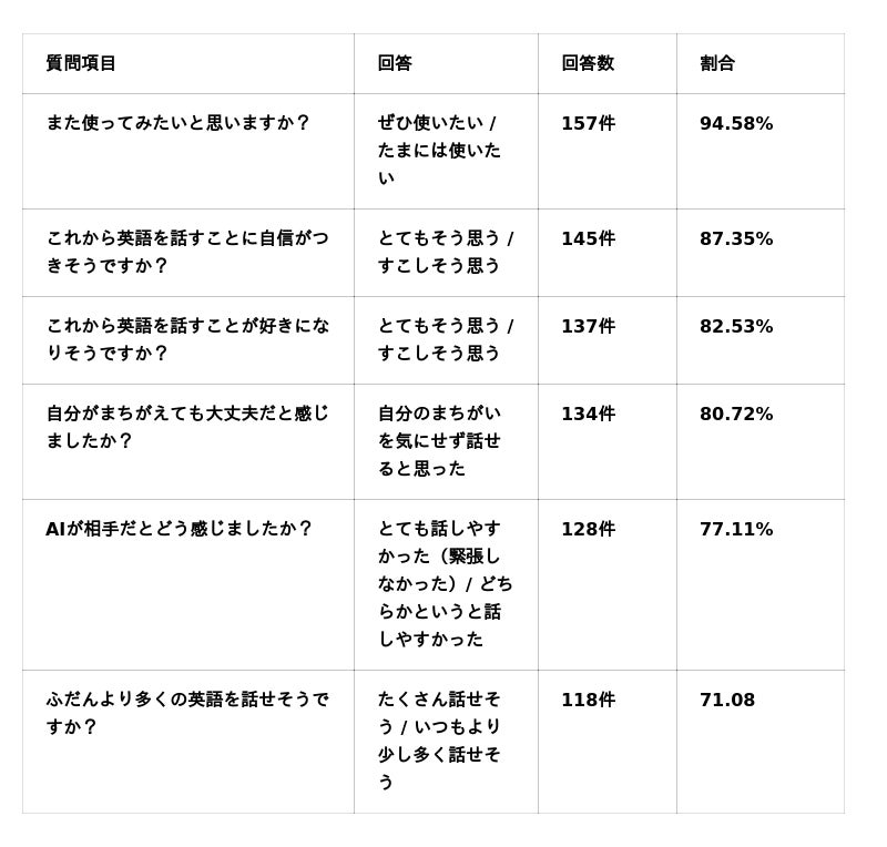 本サービスの初期トライアルを実施し、生徒(主に中学校1~3年生)からのフィードバックを得ました。アンケート結果からは、英語を話すことへの心理的な抵抗が軽減され、学習に対するポジティブな意識が向上していることが定量・定性的に確認されています。(全体回答数:166名)