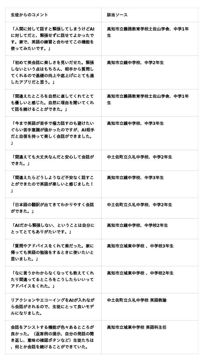 先行トライアルを行った中学校の生徒からは、AIとの英会話についてのコメントが多数寄せられました。特に、「AIだから緊張しない」「不安なく話せた」「自信を持って楽しく会話ができた」といった声が目立ち、AIによる学習サポートが、一定の心理的な安心感につながる可能性を示唆しています。