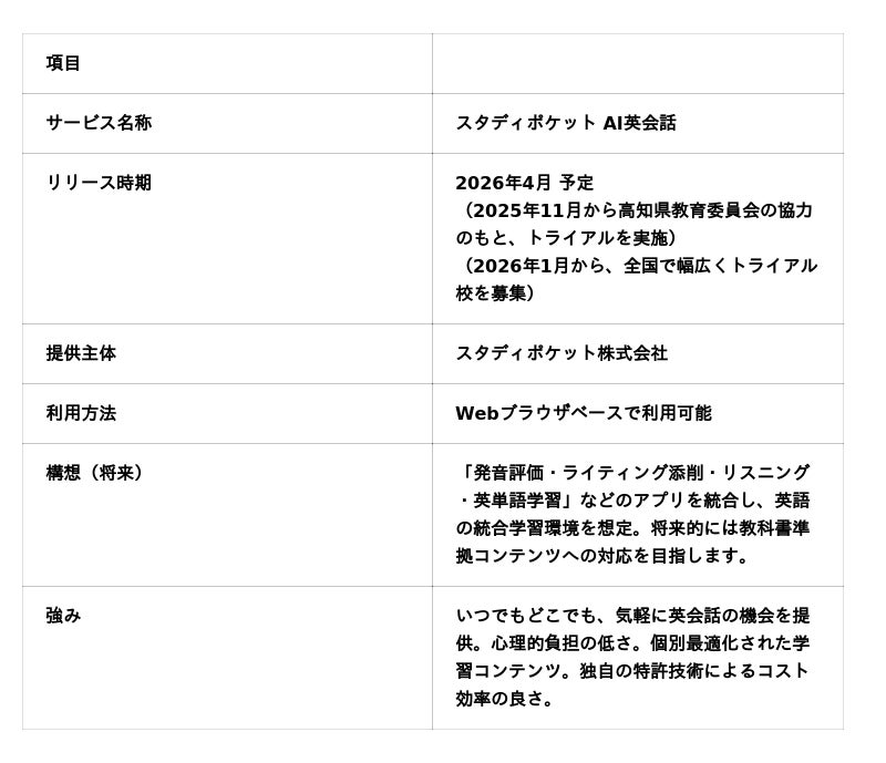スタディポケット株式会社(本社:東京都千代田区、代表取締役:山地瞭/鶴田浩之)は、生成AI技術を活用した新しい英会話学習サービス「スタディポケット AI英会話」を、2026年4月より正式にリリースすることを決定しました。