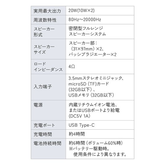 本体にはリチウムイオン電池を内蔵し、最大約6時間の連続再生が可能。屋内利用はもちろん、部屋間の移動や一時的な配線レス環境でも活躍します。USB Type-Cで簡単に充電でき、給電しながらの使用もできる2WAY仕様で、使い勝手にも優れています。