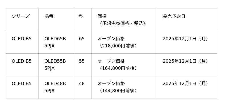 LGエレクトロニクス・ジャパン株式会社(代表取締役:孫 成周(ソン・ソンジュウ)、本社:東京都中央区)は、4K有機ELテレビのエントリーモデル「OLED B5」シリーズを、販路限定モデルとして、2025年12月1日(月)より順次発売します。