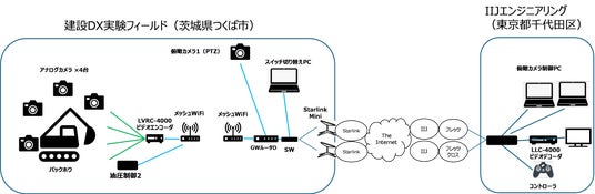 株式会社IIJエンジニアリング(本社:東京都千代田区、代表取締役社長:山井 美和、以下IIJエンジニアリング)とハイテクインター株式会社(本社:東京都渋谷区、代表取締役社長:旦尾 紀人、以下ハイテクインター)は、国立研究開発法人 土木研究所の建設DX実験フィールド(茨城県つくば市)とIIJエンジニアリングの本社オフィス間において、衛星通信Starlink 2回線と、2種類のフレッツ光回線を用いた高信頼・低遅延ネットワークを構築し、ネットワーク状況が動的に変動する環境下における建設機械(以下建機)の遠隔操縦に関する実証実験を、11月21日に実施しました。今回の実証では、山間部など通信インフラが未整備な地域でも、衛星通信と光回線による信頼性の高いネットワークならびに映像伝送環境を構築することで、建機を遅延なく安定して遠隔操縦できることを確認しました。