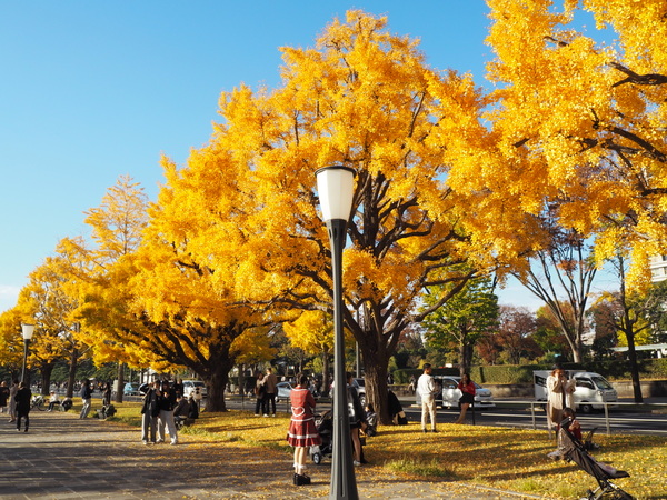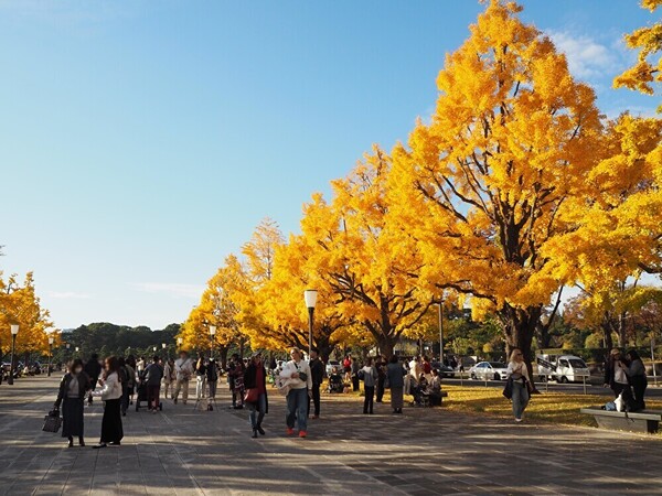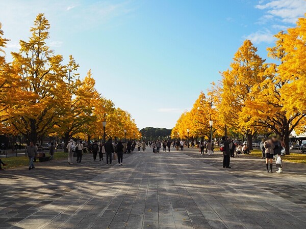 ここから皇居に向かって真っすぐ「行幸通り」を歩きます。実は私も、この通りを皇居の前まで歩くのは初めて! 中央帯は、車が入れない広々とした歩行者天国になっていて、東京のど真ん中とは思えないほど開放的な雰囲気です。皇居方面には高層ビルなども見えないので、空が広ーい。訪れたときはちょうど紅葉のシーズン真っ盛りで、両側のイチョウ並木が黄色く染まって、とってもきれいでしたよ!