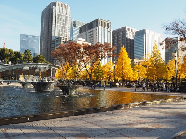ぶらぶら歩いていたら、皇居外苑の内堀通りに到着しました! 東京駅から出発すると、ここが「行幸通り」の終点です。北側(皇居に向かって右手)には噴水が美しい和田倉噴水公園があったり、南側(同じく左手)には美しい芝生が広がっていたり、意外なことに周辺には緑もいっぱい。まるで大都会のオアシスのようです。イチョウの木々や皇居外苑の緑も見える気持ちのいい空間で、気分もすっかりリフレッシュできました。