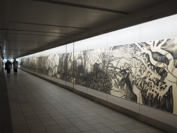 訪れたときは木炭画の作品が展示されていましたが、展示がない期間には、常設展示として丸の内界隈の歴史や自然などを紹介するパネルが飾られるのだとか。展示は随時替わるので、地上のイチョウ並木と併せて地下を歩くのも、また楽しみのひとつになりそうですね!