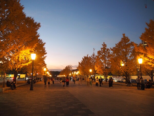 「行幸地下ギャラリー」を見て地上に戻ったら、ちょうど夕暮れどきでした。昼間もいいですが、この時間の景色もまた素敵ですねー! 温かみのあるちょっぴりレトロな照明が点々と灯り、石畳の道と美しく調和しています。