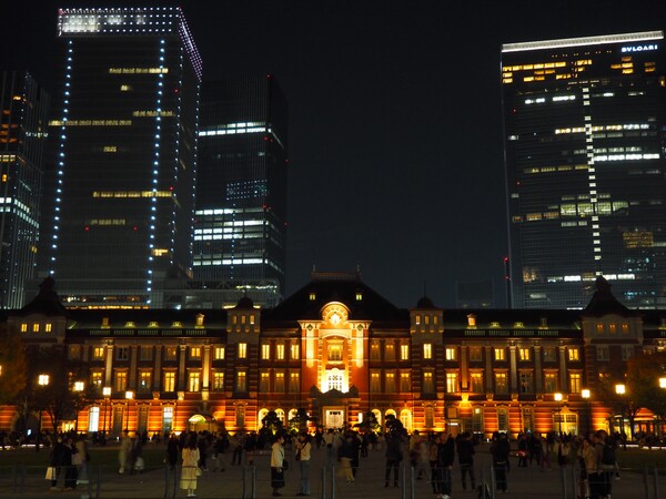そして、だんだんと近くなるJR東京駅の丸の内駅舎がまた美しいこと! ここは駅舎の夜景を正面に望める絶好のスポットとしても有名で、多くの人だかりができていましたよ。ライトアップされた赤レンガの駅舎は幻想的な趣で、ヨーロッパのどこかの街のよう。いつまでもずっと見ていたくなる光景です。