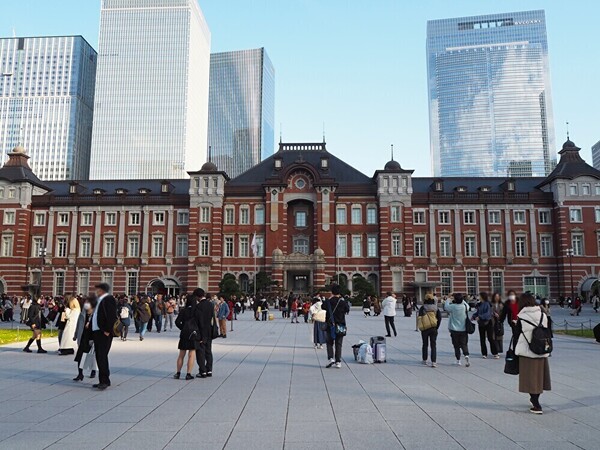 さっそく丸の内中央口の丸の内駅前広場から皇居に向けて散策スタートです! まずは振り返って赤いレンガ造りの丸の内駅舎を眺めます。この広場から駅舎を見るのは丸の内散策の定番中の定番! 1914(大正3)年の創建当時の姿が復元されていて、いつ見ても荘厳で美しい姿にうっとり。